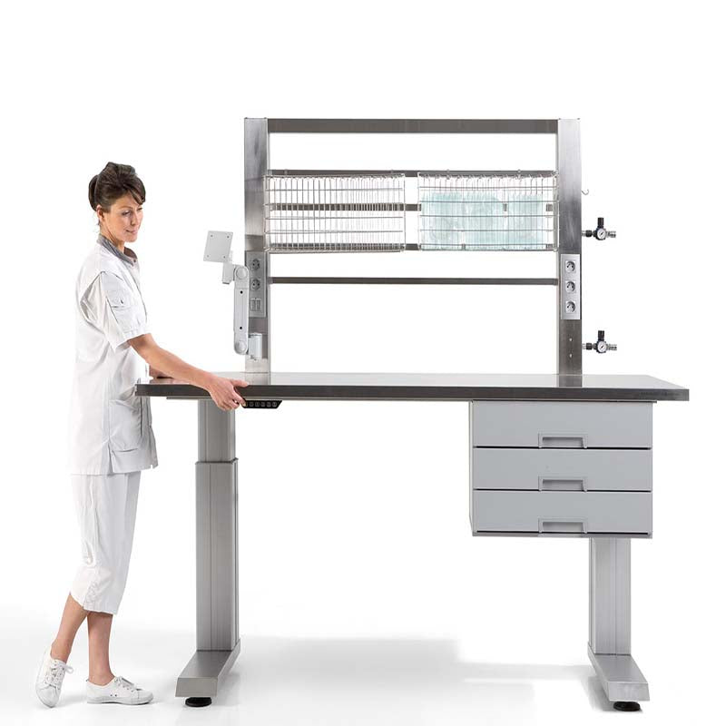 Fitted with two robust lifting pillars in anodised aluminium, each column can susport a weight of 150kg. In case of overload, the lifting pillars stop automatically. Additionally the feet of the table are stainless steel and have levelling adjusters.